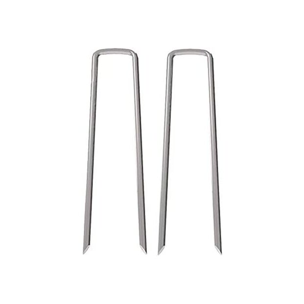 Pack of 10 artificial turf galvanised U pins with bevelled ends for easy insertion into the groundSize: 15cm x 3cm x 0.3cm (150mm x 30mm x 3mm)