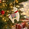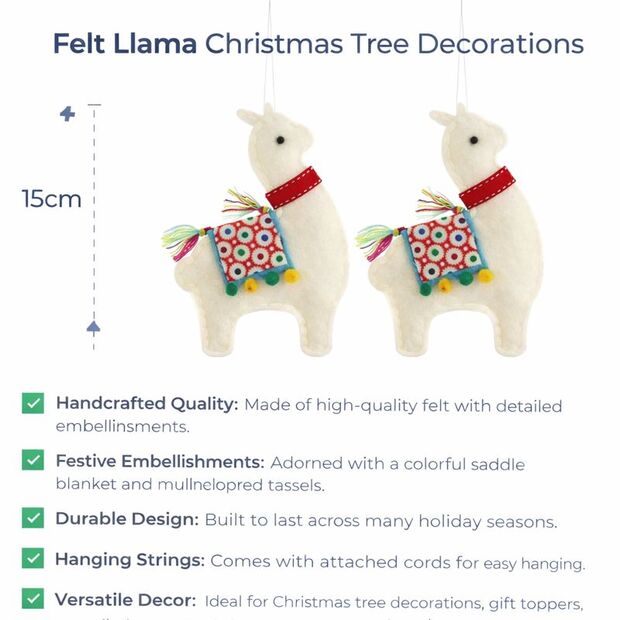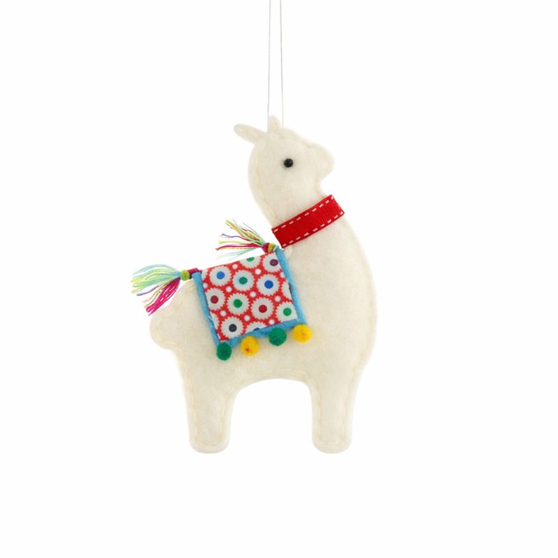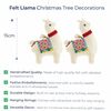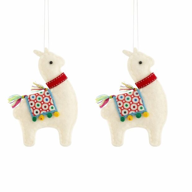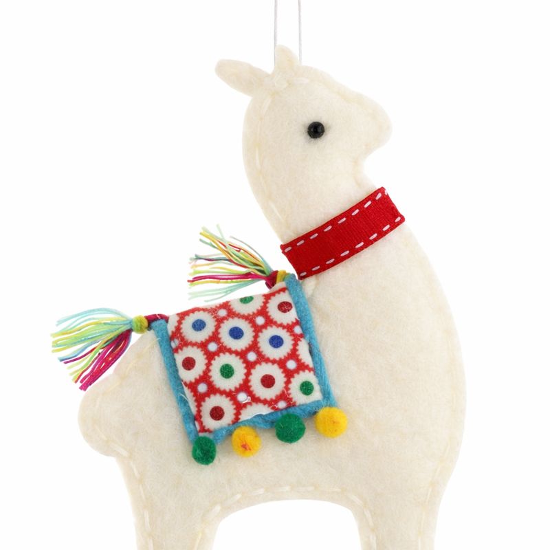 Add instant festive character with this 15cm felt llama hanging decoration. Finished with a bright saddle blanket, tassels and pom-pom trim, it’s a cheerful choice for Christmas trees, wreaths, garlands and gift presentation.