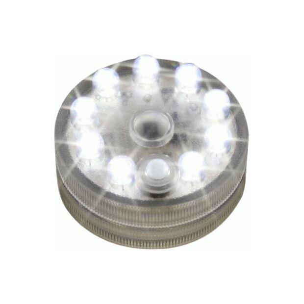 Pack of 3 submersible light bases, each with 9 white LED lights. Use replaceable batteries.