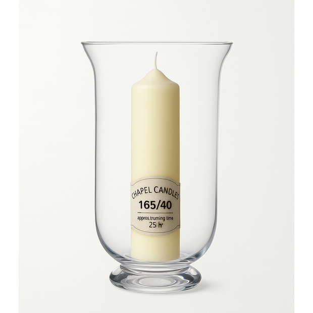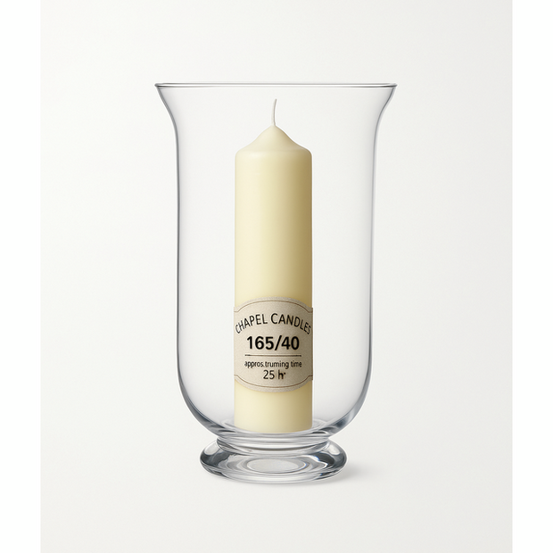 Made from thick, clear glass with a solid base, it’s designed for safety, style, and everyday use. Ideal for creating soft candlelight with a Wenzel 40mm x 165mm chapel candle.