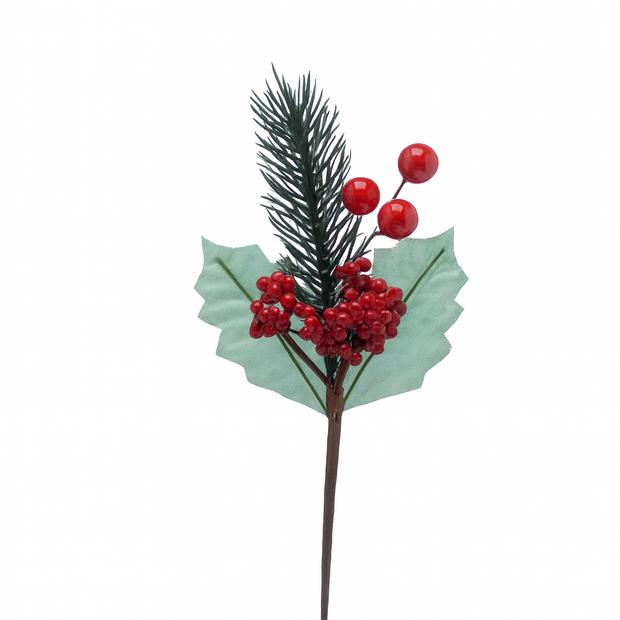 Add a touch of holiday elegance to your seasonal decor with the Festive® 20cm Mixed Red Berries Pick. This charming festive pick features two clusters of rich, dark red glossy holly berries, complemented by a realistic pine branch and two green fabric leaves for an authentic, nature-inspired look. Mounted on a 20cm wire stem covered in brown paper, this decorative piece is perfect for a wide variety of Christmas crafts and arrangements.