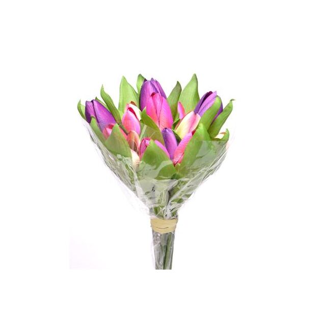 Add a touch of elegance to your space with the 28cm Artificial Tulip Bunch in Purple/Pink. This beautiful bunch features 8 stems of vibrant tulips, each made from high-quality fabric flowers on durable plastic stems. Each bunch is neatly wrapped in a cellophane sleeve and tied with raffia, making it a perfect choice for floral arrangements or decorative displays.