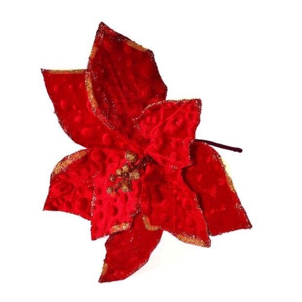 Enhance your holiday décor with the Red Velvet Poinsettia Pick, a stunning artificial flower designed to bring a touch of luxury and sophistication to any festive setting. Standing at 29cm in height with a fully open diameter of 29cm, this exquisite poinsettia boasts rich, embossed red velvet petals that exude elegance. The addition of gold glittered fabric leaves and stamen gives the flower a subtle yet radiant sparkle, elevating your holiday arrangements with a festive flair. Each petal is individually wired, allowing for flexible posing and perfect placement in wreaths, garlands, or large tree displays. The brown paper-covered wire stem offers durability and ease of use for a seamless arrangement. Ideal for larger trees, corporate displays, and hospitality settings, this impactful Red Velvet Poinsettia Pick is the perfect statement piece to ensure a luxurious, festive atmosphere.