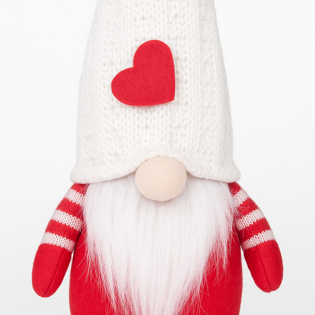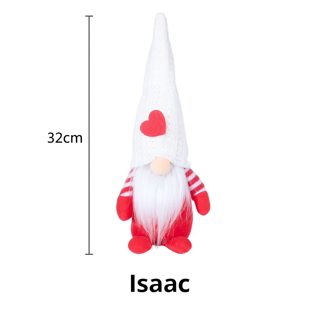 Spread seasonal joy with Isaac, the 32cm Santa Gonk. Featuring a cosy knitted white hat with red heart detail, Isaac is perfect for Christmas gifts, home décor, retail displays and event styling.