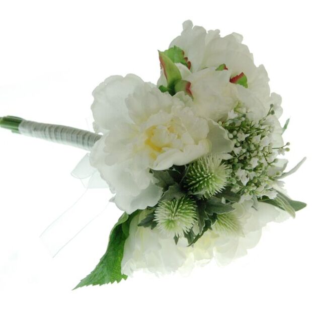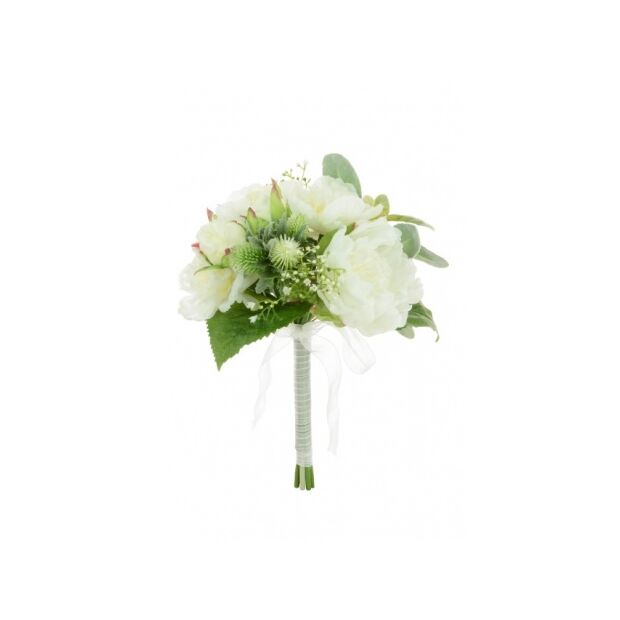 The bouquet has 7 stems of peonies which is complemented with eryngium, gysophilia and 2 different types of green foliage. It is finished with a tied organza ribbon and bow.