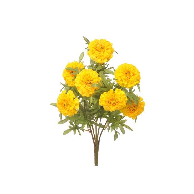 Very realistic artificial fabric yellow marigold bush.Colour: YellowNumber of stems: 5Number of flowers per stem: 2Flower diameter: 8cmStem length: 46cmsPack quantity: 1 bush