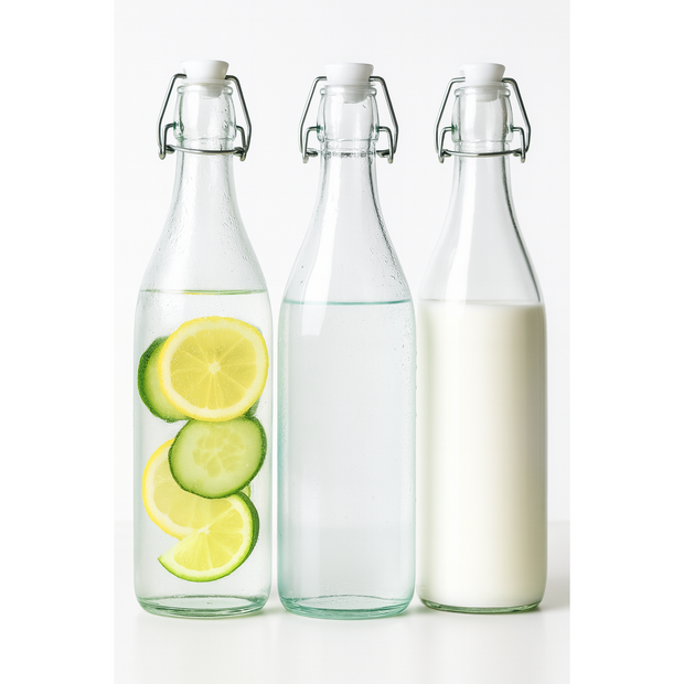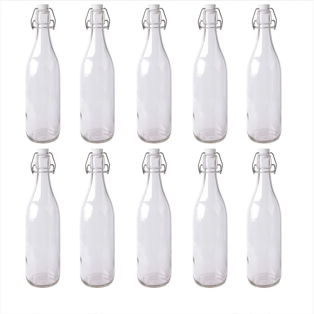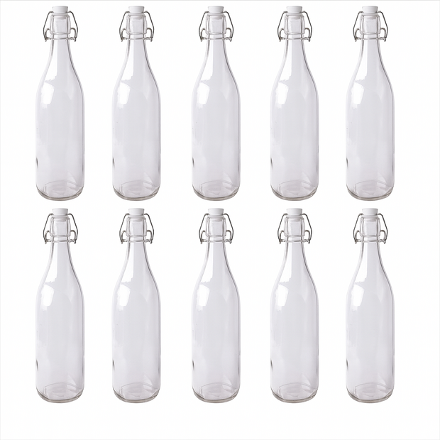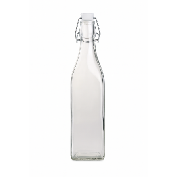 Trade pack of 12 Floralcraft® 500ml Flip Top Bottles made from durable clear glass with secure swing/clip tops and rubber seals. These airtight, reusable bottles are ideal for bottling cordials, kombucha, infused oils and syrups, as well as for gifting, wedding favours and decorative displays. A wider neck makes filling easy and also suits creative styling with flower stems or LED lights.