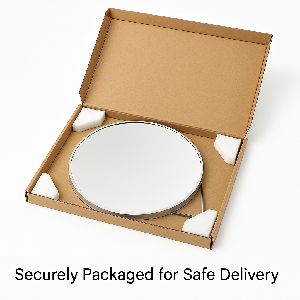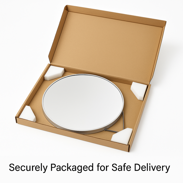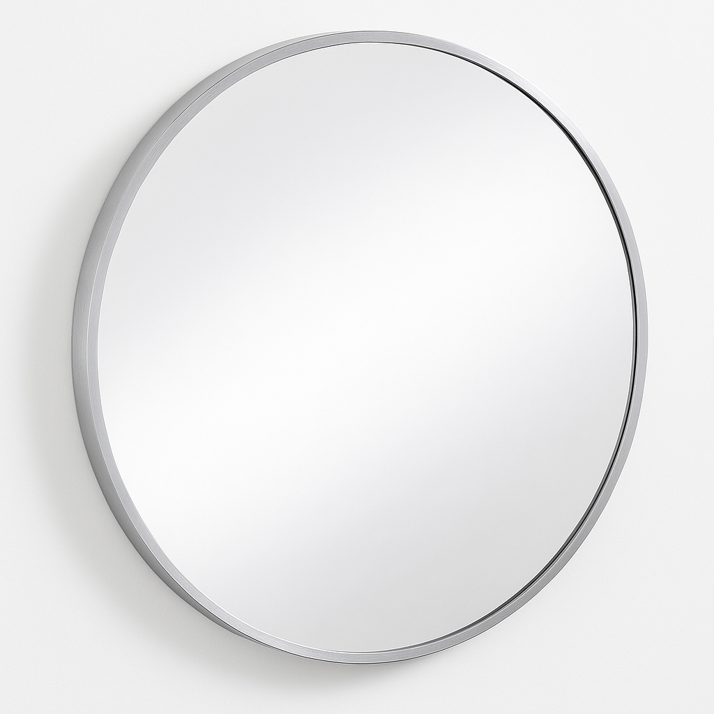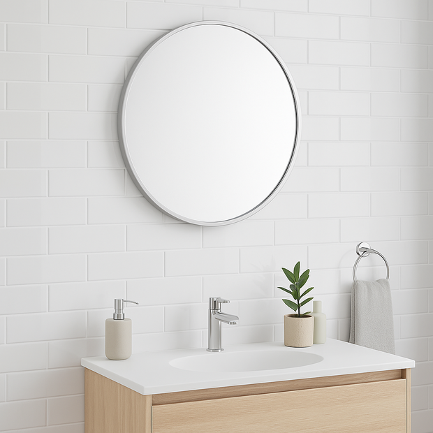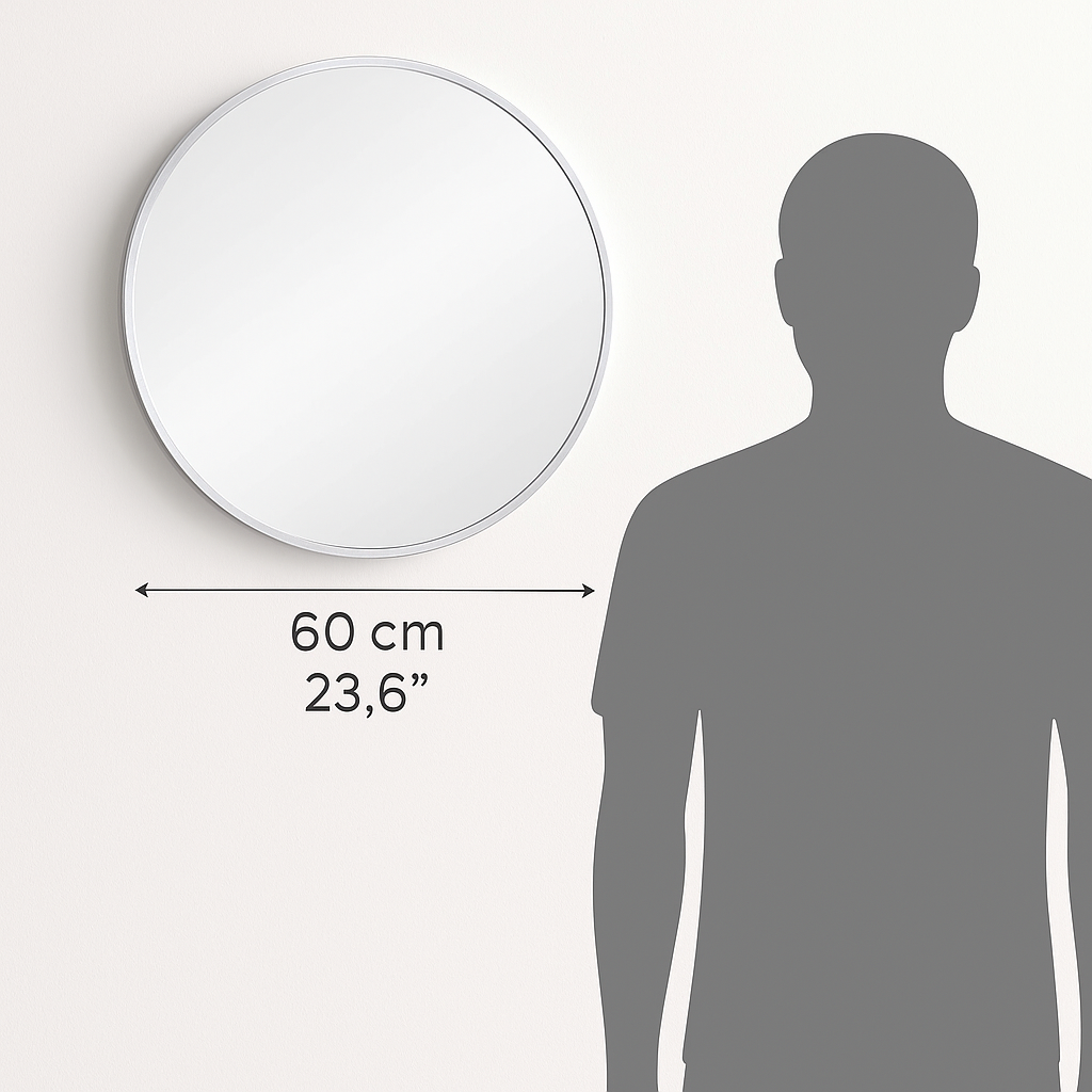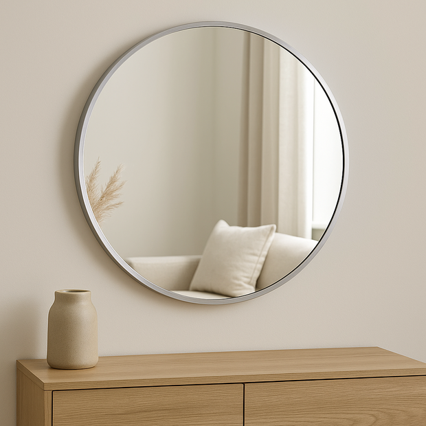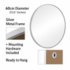 Elegant 60cm round wall mirror with a sleek silver metal frame. Perfect for bathrooms, bedrooms, and living rooms. Ready to hang, durable, and modern.