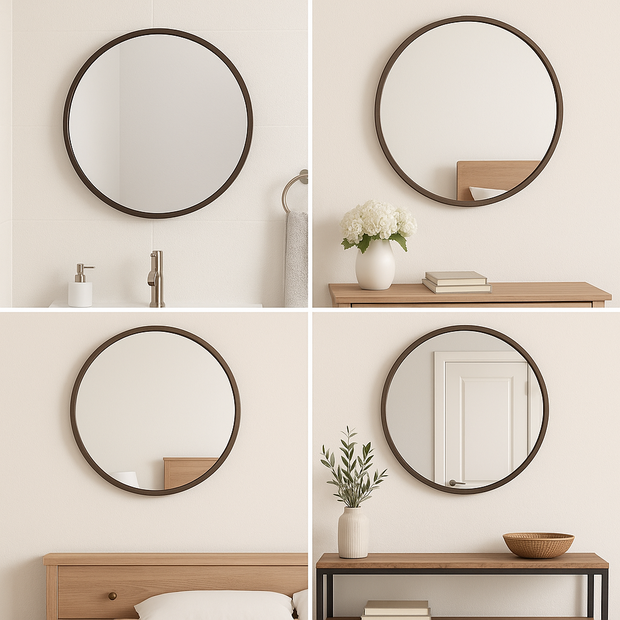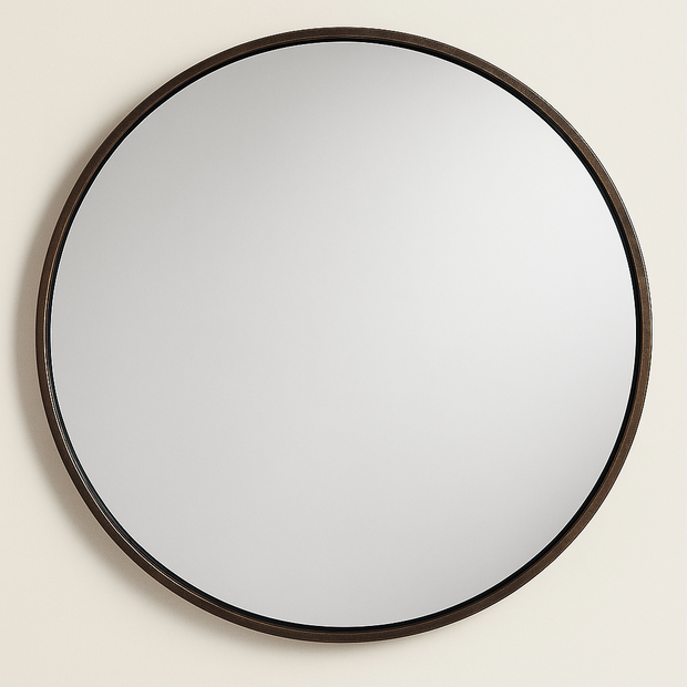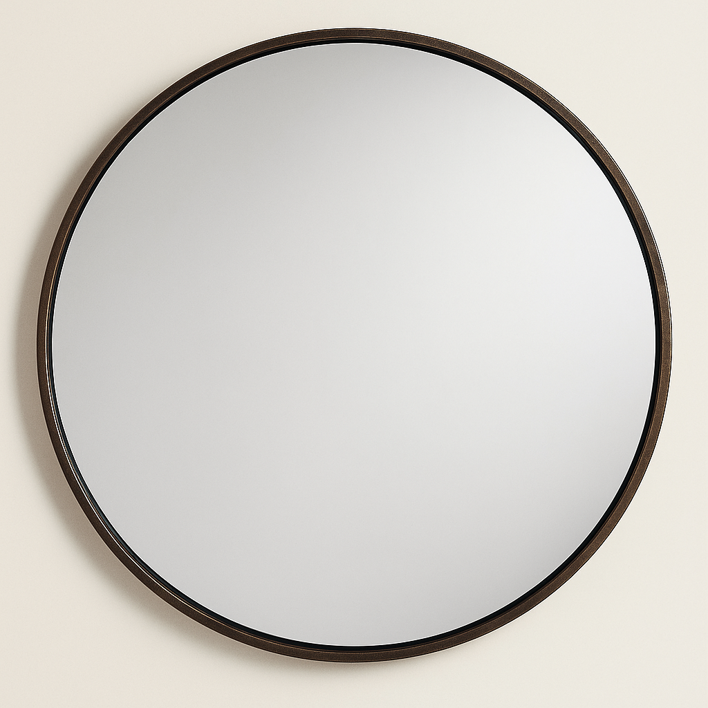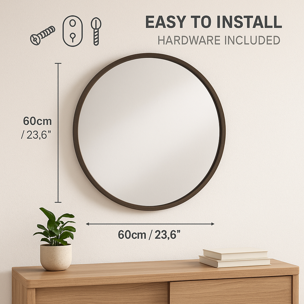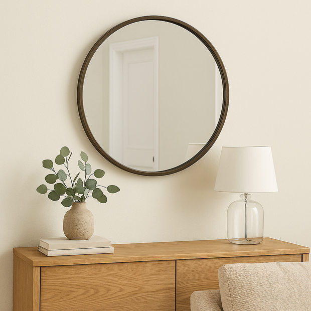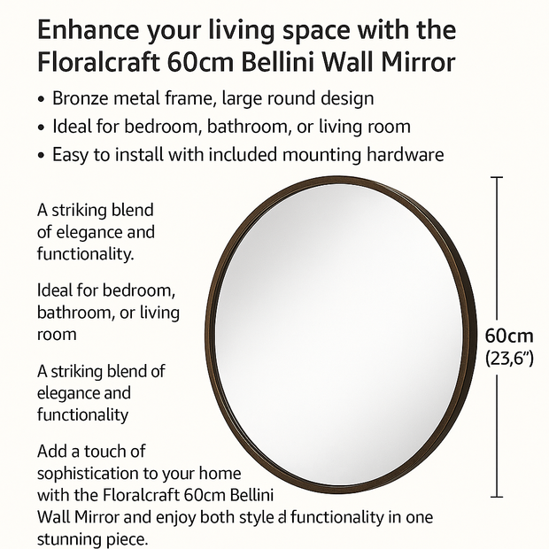 Enhance your living space with the Floralcraft 60cm Bellini Wall Mirror, a striking blend of elegance and functionality. Featuring a bronze metal frame, this large round mirror adds a touch of sophistication to any room, whether it's your bedroom, bathroom, or living room.