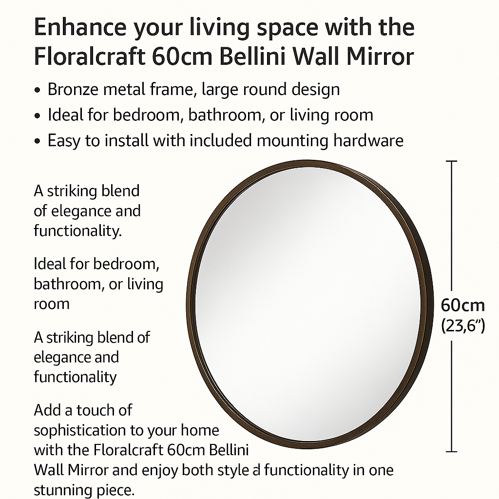 Add a touch of sophistication to your home with the Floralcraft 60cm Bellini Wall Mirror and enjoy both style and functionality in one stunning piece.