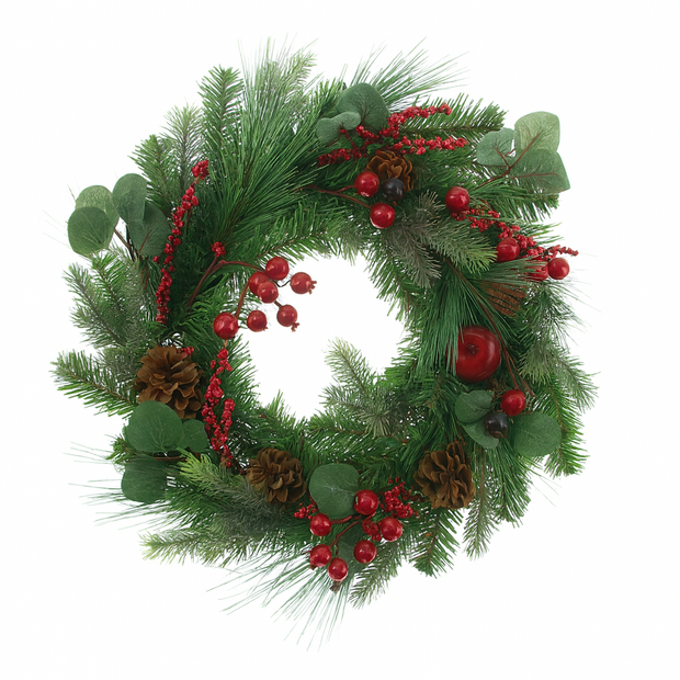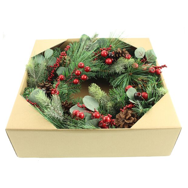 Enhance your holiday decor with the 60cm Luxury Christmas Pine Wreath, a stunning masterpiece designed to bring festive elegance to any space. This exquisite wreath is crafted with a lush blend of artificial holly berries, eucalyptus, pine branches, rosehips, and Pinus Strobus pinecones, creating a rich and natural look that will instantly elevate your holiday ambiance. Skillfully arranged on a sturdy 35cm wire frame, the wreath expands to a generous 60cm in diameter when fully fanned, making it the perfect statement piece for your front door, fireplace, or wall. Add a touch of luxury and charm to your home this holiday season with this beautiful, timeless wreath.