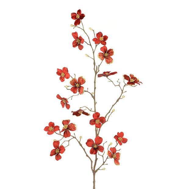 The Floralsilk® Velvet Red Mini Dogwood is a stunning floral accent perfect for Christmas arrangements and displays. With its 85cm length, this elegant stem features luxurious red velvet material that adds a rich, festive touch. The deep red color is beautifully complemented by delicate flowers adorned with gold centers, some petals tipped with gold accents. The design includes both fully bloomed heads and budding flowers, offering a dynamic and life-like appearance. Ideal for enhancing wreaths, garlands, or any holiday centerpiece, this mini dogwood brings a sophisticated warmth to any festive setting.