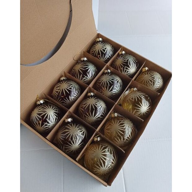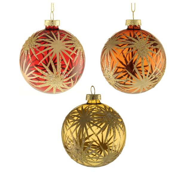 Elevate your holiday decor with the stunning 8cm Painted Glass Bauble Set featuring a dazzling Starburst design. This set of three hand-painted glass baubles showcases an exquisite assortment of colors: vibrant red, warm amber, and radiant golden yellow. Each bauble is adorned with a glittering starburst pattern that captures the festive spirit, while the plain gold starburst adds a touch of elegance and sophistication.