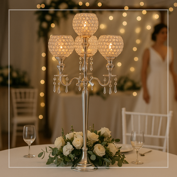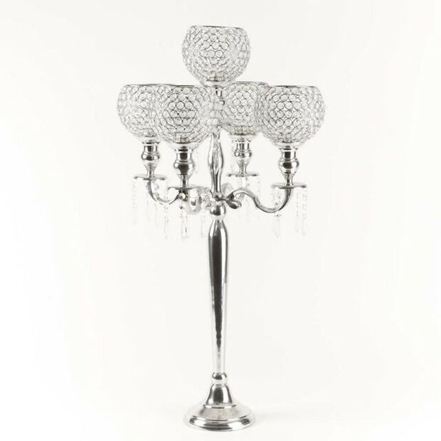 Aluminium Candelabra with 5 Tealight Globes & Acrylic Drops