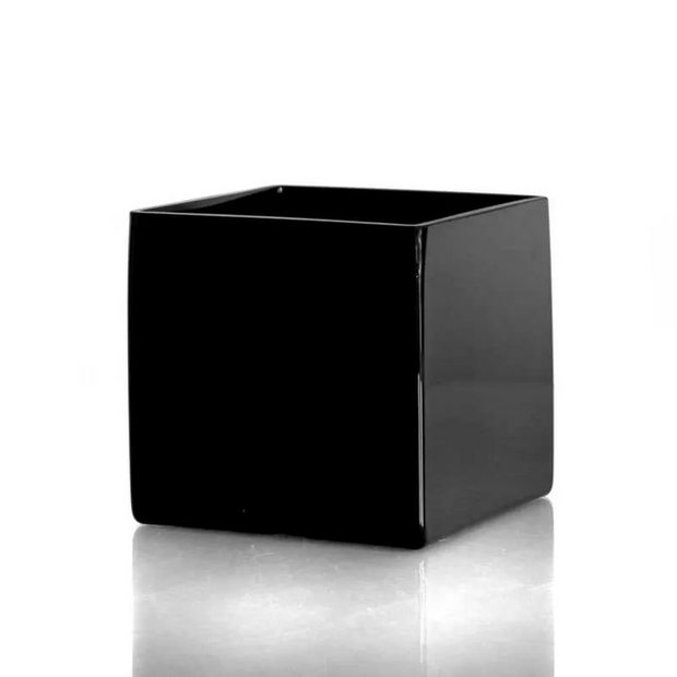 Sleek, black 12cm APAC. cube vase. A firm favourite with modern brides with the current fashion for black & white themed weddings. Very effective arranged in a row of 3 or 4 along the centre of reception tables.