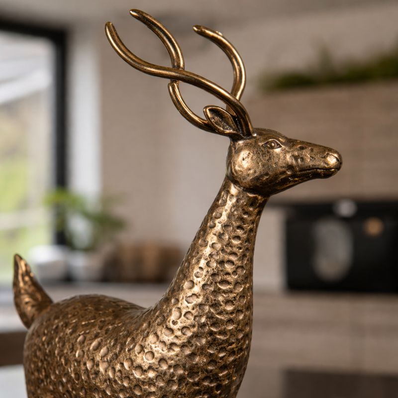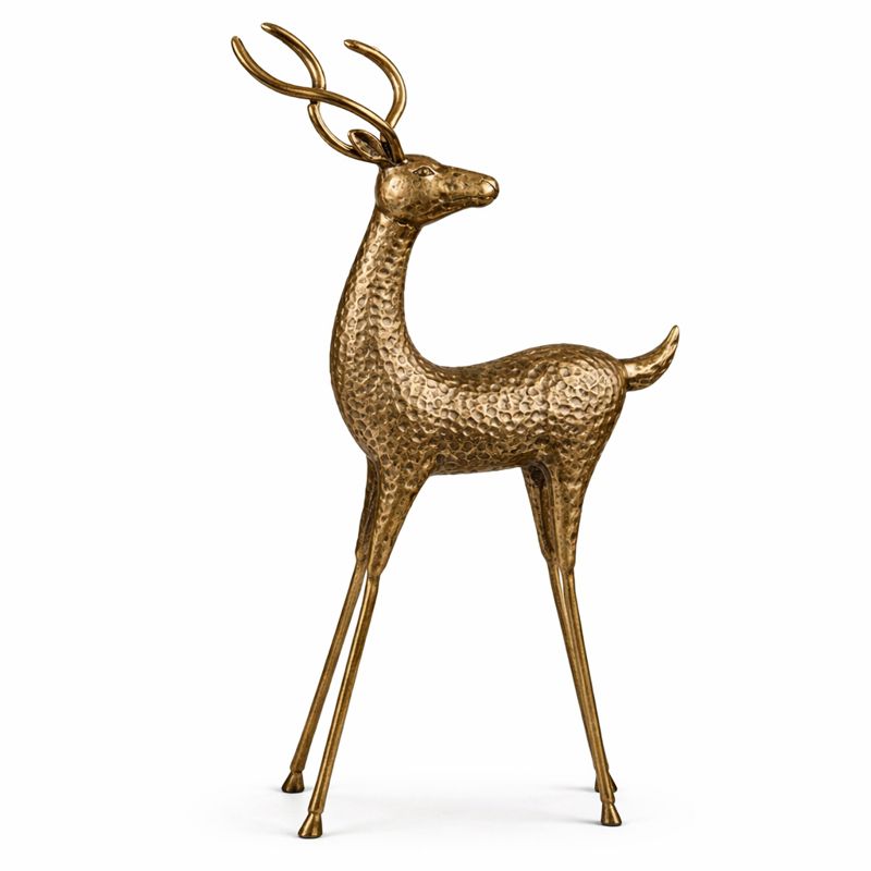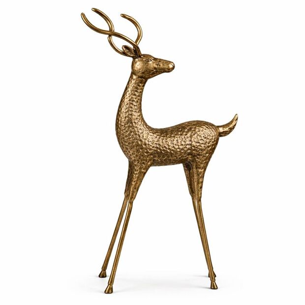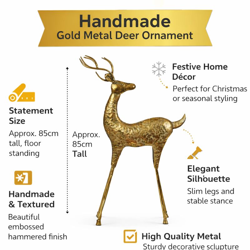 This gold metal deer ornament is a striking decorative piece, handmade from metal and finished in a rich antique gold tone. Featuring a beautifully embossed, hammered texture, this elegant stag adds depth, character, and a premium feel to seasonal or year-round displays.
