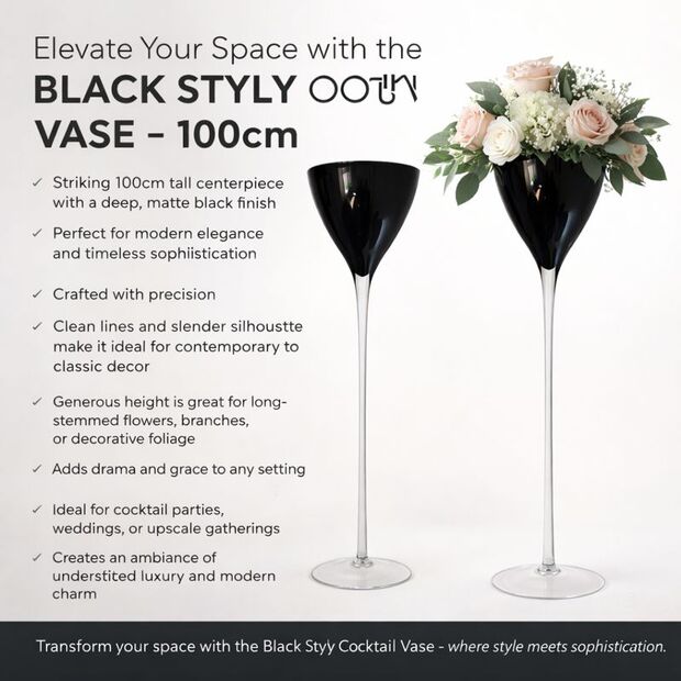 The deep black finish adds a sophisticated touch, making it ideal for upscale events, weddings, corporate functions, and luxury interiors. At 100cm tall, this cocktail vase is perfect for long-stemmed flowers, branches, and decorative foliage, giving your arrangements maximum impact and presence.