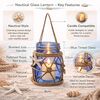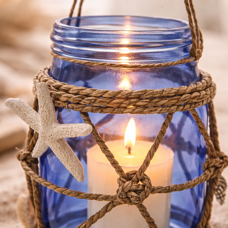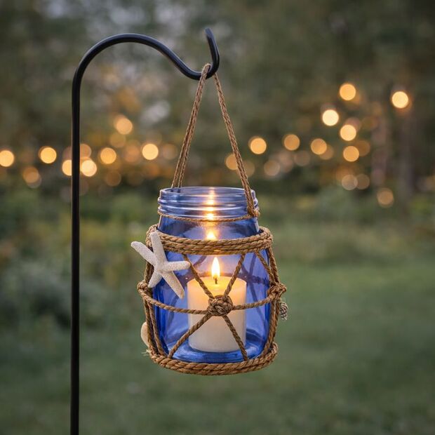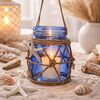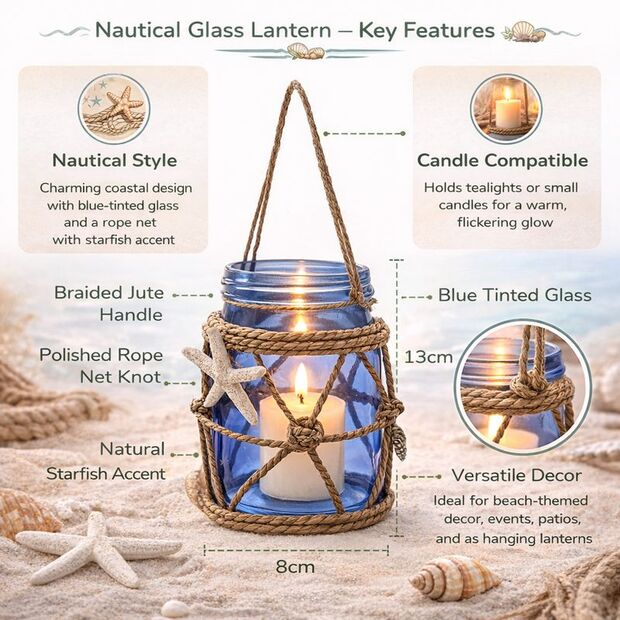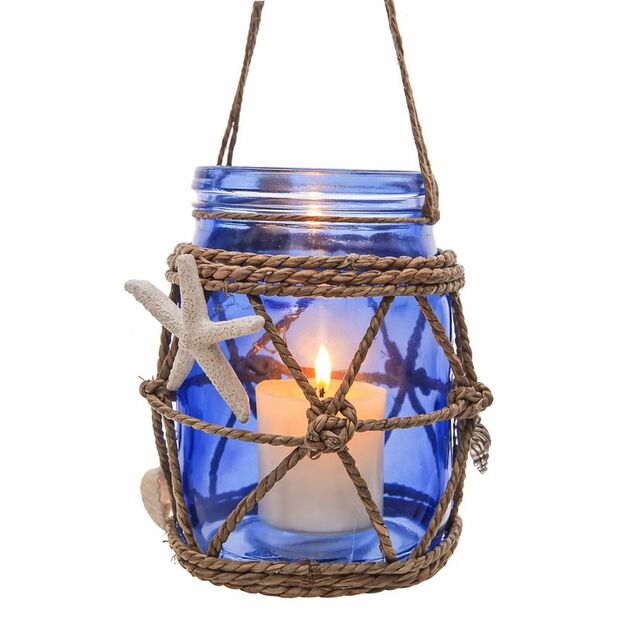 Add a relaxed coastal feel to your display with this blue glass hurricane jar lantern,