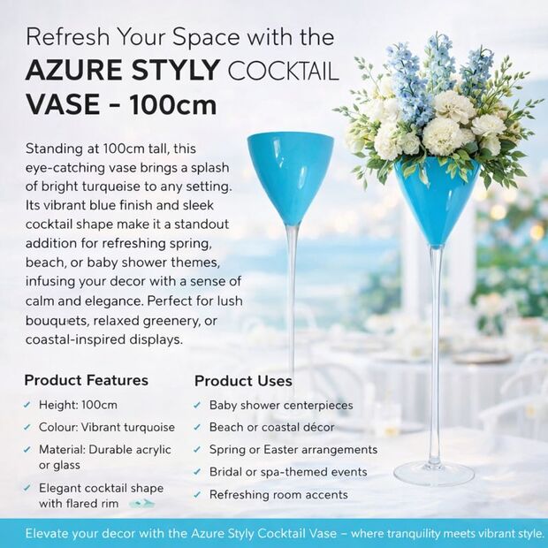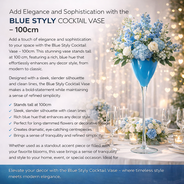 Bring bold colour and modern elegance to your event décor with the Blue Styly Cocktail Vase (100cm). This tall, striking vase is designed to create dramatic floral centrepieces and eye-catching displays for weddings, parties, and luxury interiors.