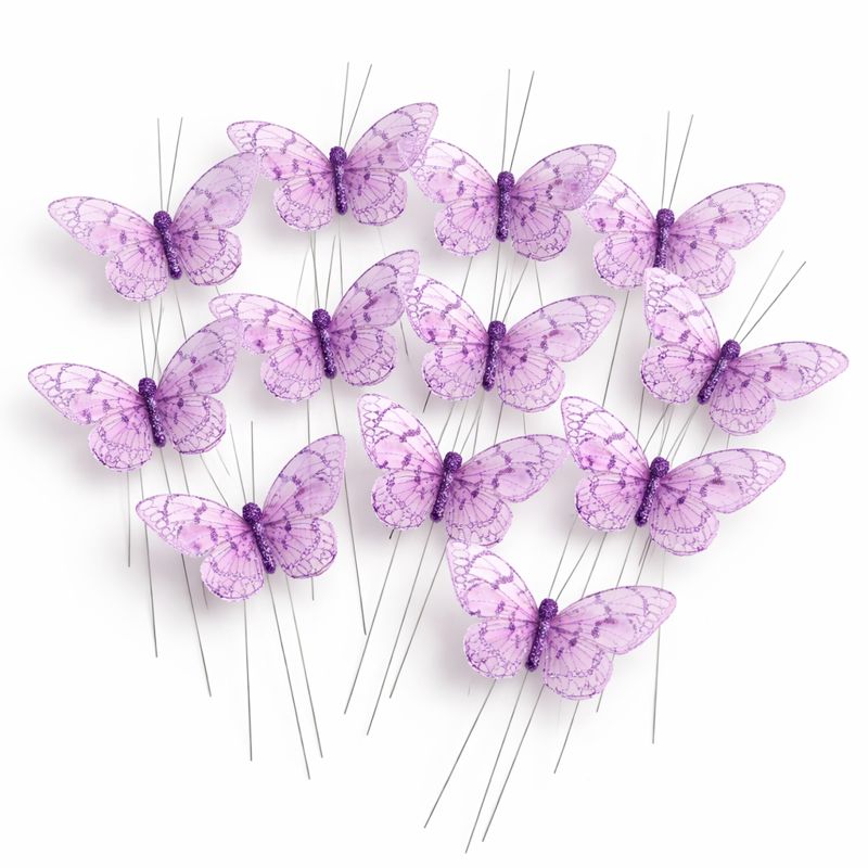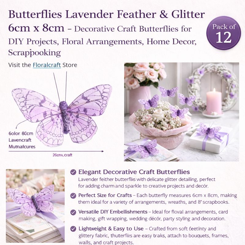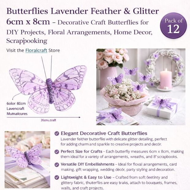 These enchanting lavender butterflies, measuring 6cm x 8cm, are crafted with delicate feathers and a touch of glitter for a whimsical sparkle. Each butterfly is mounted on a bendable wired stem, allowing for flexible shaping and secure attachment. Ideal for floral arrangements, gift wrapping, wedding decor or creative crafts, they add charm and elegance to any project. Their soft pastel hue and subtle shimmer make them a beautiful addition to seasonal displays or special occasions. Whether you're decorating for a party or designing a bouquet, these butterflies bring beauty and versatility to your work.