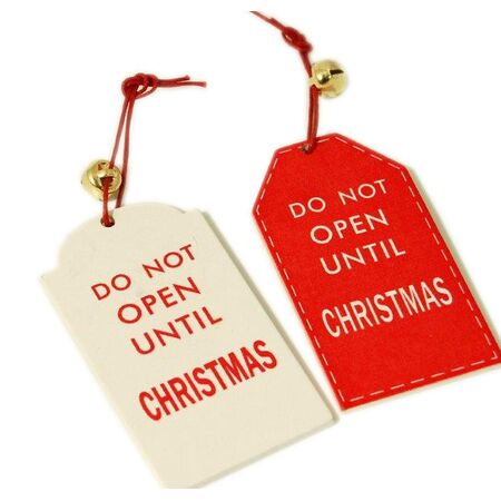 Add a personal touch to your holiday gifts with the Christmas Tags - Do Not Open by Michael Dark. This charming set includes two wooden tags featuring the festive message "Do not open until Christmas." Each tag is adorned with a delightful gold bell, attached with a loop of red string for easy hanging. These tags are perfect for gift wrapping or as Christmas tree hangers. The reverse side is left blank for your special message, making them both practical and decorative.