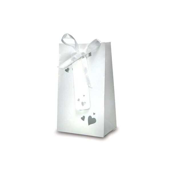 Pearlised White finish square wedding favour box with heart motif and bow trim. Choice of colours, suitable for bridal, christening and any special occasion gifts.