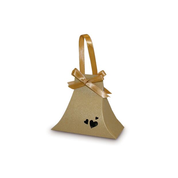 Pearl Gold finish handbag shaped favour box with heart motif and matching ribbon handle and trim. Several colours to choose from and available in other designs.