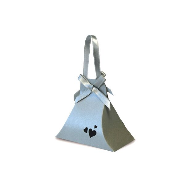 Pearl Silver finish handbag shaped favour box with heart motif and matching ribbon handle and trim. Several colours to choose from and available in other designs.