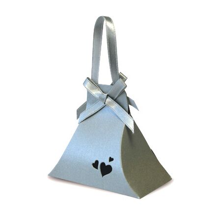 Pearl Silver finish handbag shaped favour box with heart motif and matching ribbon handle and trim. Several colours to choose from and available in other designs.