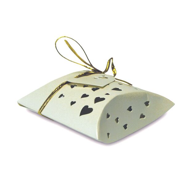 Pearlised Ivory finish pillow shaped favour box with heart motif and bow trim. Several colours to choose from and available in other designs.