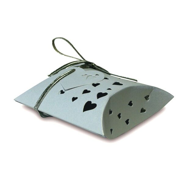 Pearlised Silver finish pillow shaped favour box with heart motif and bow trim. Several colours to choose from and available in other designs.