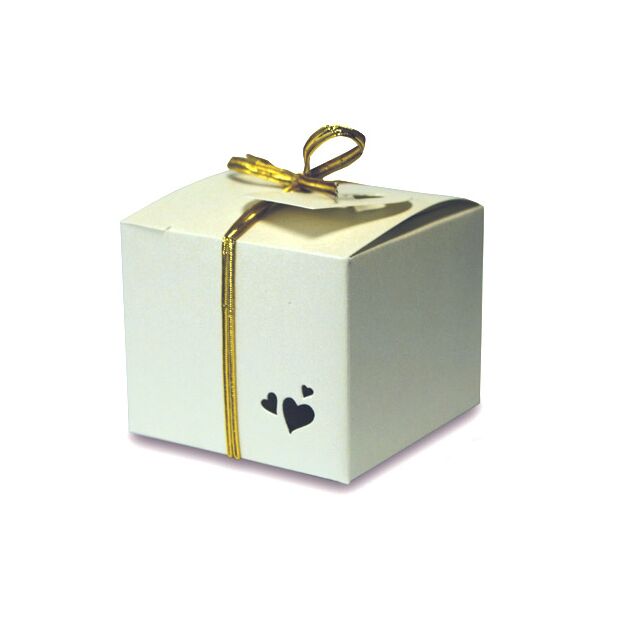 Pearlised Ivory finish square wedding favour box with heart motif and bow trim. Choice of colours, suitable for bridal, christening and any special occasion gifts.