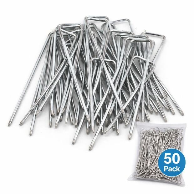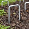 Floralcraft® 10cm galvanised turf pins in a trade-friendly pack of 50. Made from strong 2mm steel wire with sharp ends for securing weed membrane, netting, fleece and ground fabric.