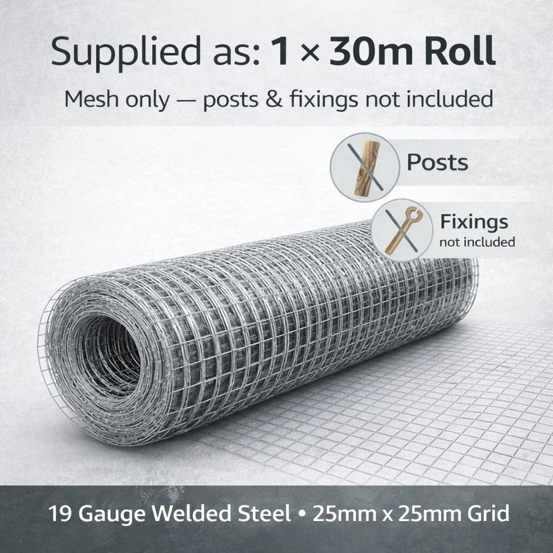 Supplied in trade-friendly packs: 1 × 30m roll of galvanised welded mesh (mesh only). Posts & fixings not included.