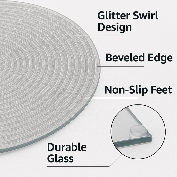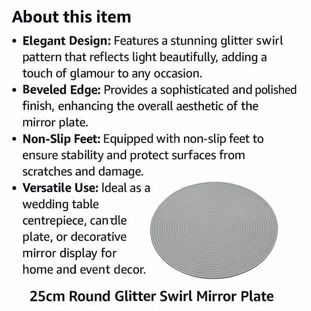 At 25 cm, this plate gives you a bold yet manageable size for arrangements. The glitter top layer adds shimmer under candle or ambient lighting, while the bevelled mirror edge frames the effect elegantly.