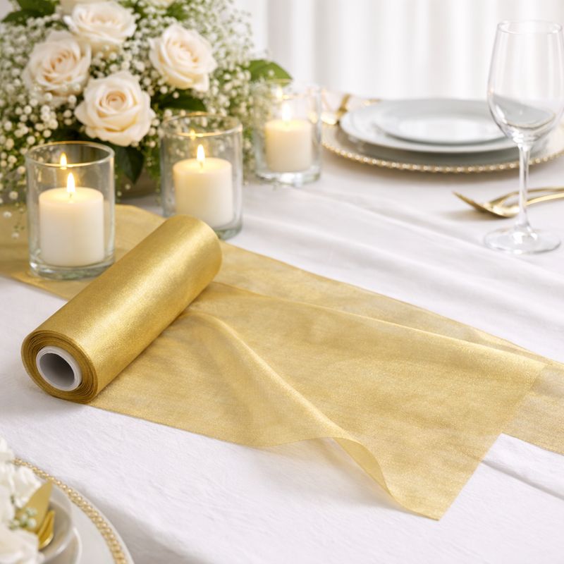 Gold organza is ideal for festive décor, luxury events and classic wedding themes, pairing beautifully with whites, greenery, reds and neutral tones.