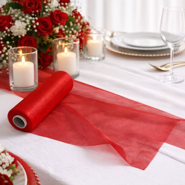 Red organza is ideal for festive styling, romantic themes and bold event décor, pairing well with gold, greenery, whites and winter accents.