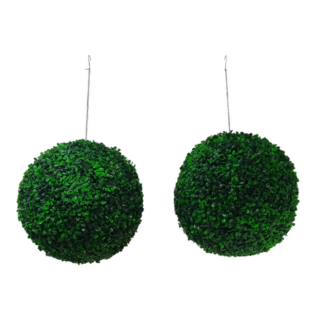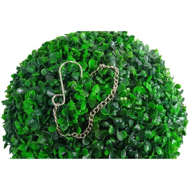 Add a touch of lush, everlasting greenery to your space with the FLORALCRAFT® 35cm Topiary Ball. Crafted from high-quality, UV-protected, and waterproof plastic, this artificial boxwood topiary ensures a vibrant look year-round, no matter the weather. Designed for convenience, it features a 33cm (13") chrome-plated hanging chain with a secure hook attachment, making it easy to hang in any indoor or outdoor setting. Its fine workmanship and rich detailing give the topiary a natural, elegant look, perfect for weddings, events, or home decoration. Ideal for enhancing garden aesthetics or adding a hint of sophistication to parties and special gatherings.