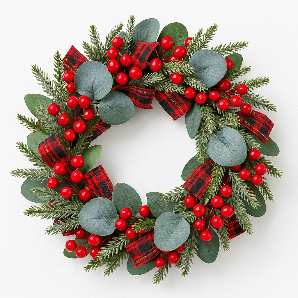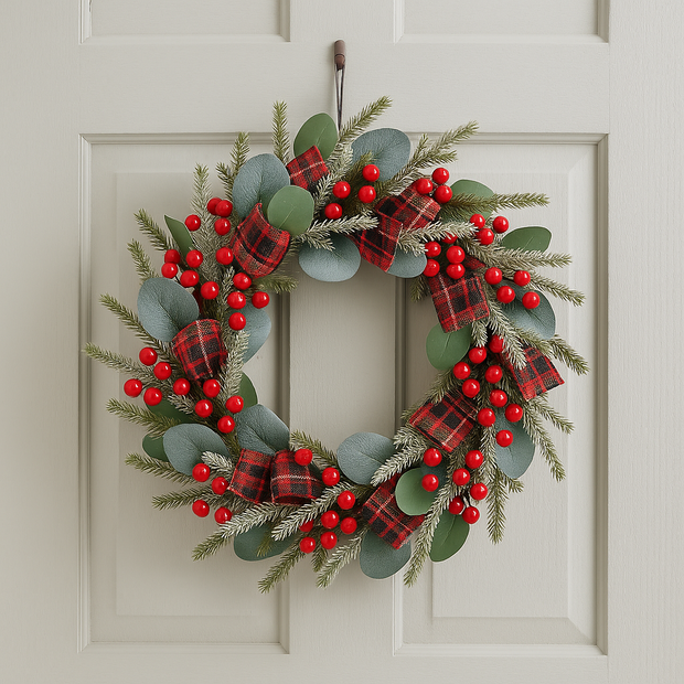 Welcome guests this season with the Floralcraft® 40cm Christmas Wreath, a stunning pre-decorated design combining timeless festive details. The wreath features glossy red berries, frosted evergreen foliage, realistic eucalyptus leaves, and a bold red tartan ribbon for a classic seasonal look.