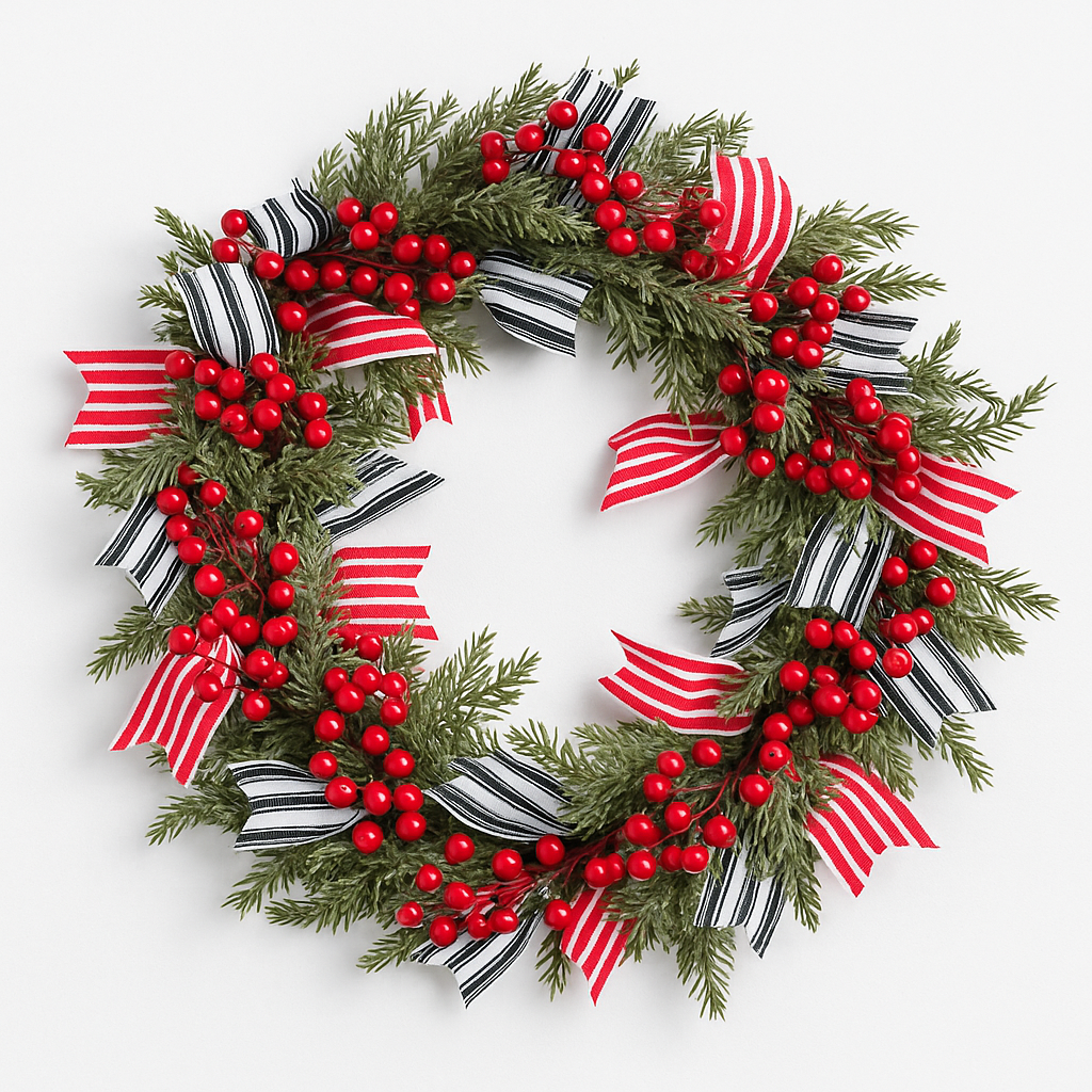 Add festive elegance with the Floralcraft® 45cm Christmas Wreath – Berries & Striped Ribbon. Crafted with frosted evergreen foliage and decorated with glossy red berries, this artificial wreath is finished with bold striped red and black ribbons – giving it a modern twist on a classic design.