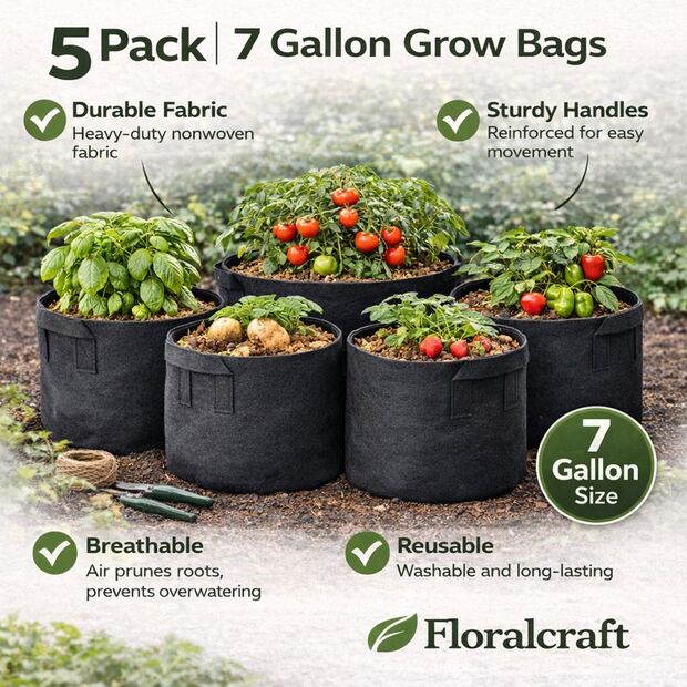 The Floralcraft® 7 Gallon Felt Grow Bags (Pack of 5) are designed for growing vegetables, fruit and larger plants with excellent drainage and healthier root development.