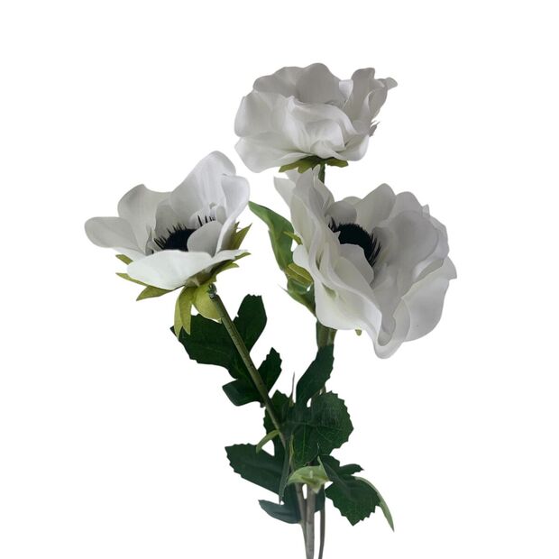 Two larger flower heads measure approx. 10 × 7.5cm, while the smaller head is around 6 × 6cm. The crisp white colouring makes this anemone spray a favourite for weddings, christenings and elegant floral displays.