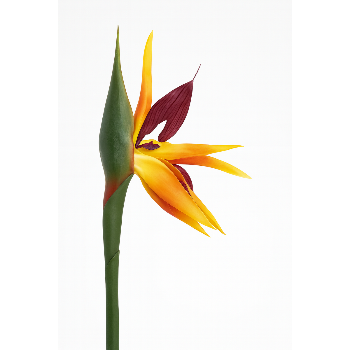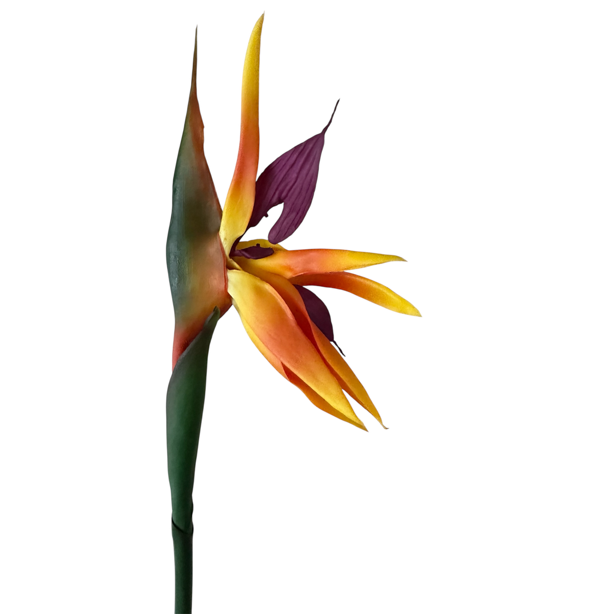 The flower head is crafted with real-touch petals in vibrant orange and purple, replicating the bold look of the Strelitzia bloom. The resin-filled stem adds weight and stability, while the shaded green finish gives a natural appearance. Each detail has been carefully designed for durability and authenticity, making this stem a high-quality option for long-term use.