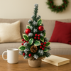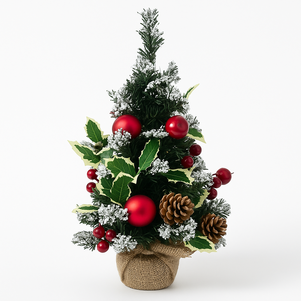 Bring instant festive cheer to any space with this beautifully decorated 40cm Artificial Mini Christmas Tree. Designed with realistic green branches dusted with snow effect, this compact tree comes pre-decorated with vibrant red baubles, glossy berries, natural pinecones, and variegated holly leaves. The base is wrapped in rustic burlap, making it a charming and ready-to-display seasonal decoration.