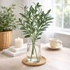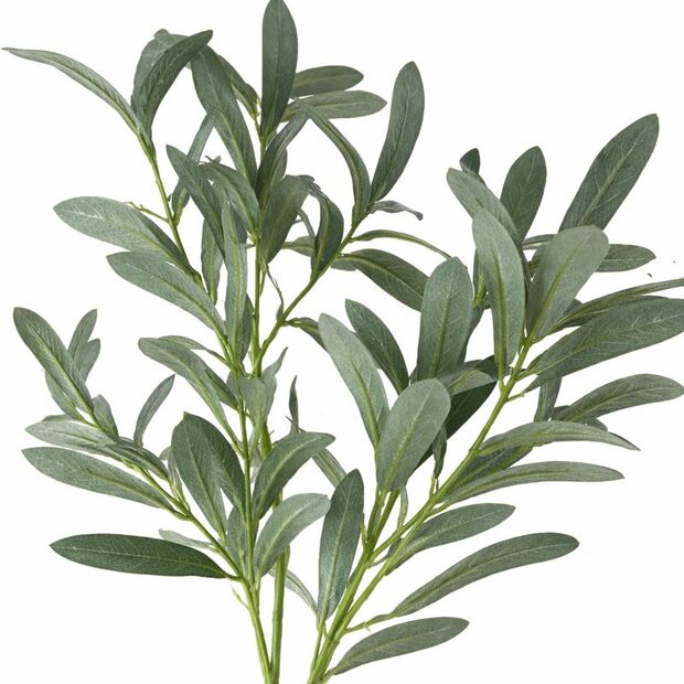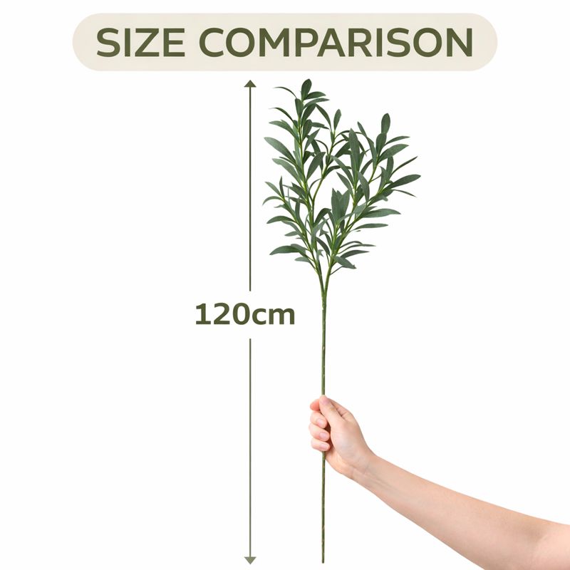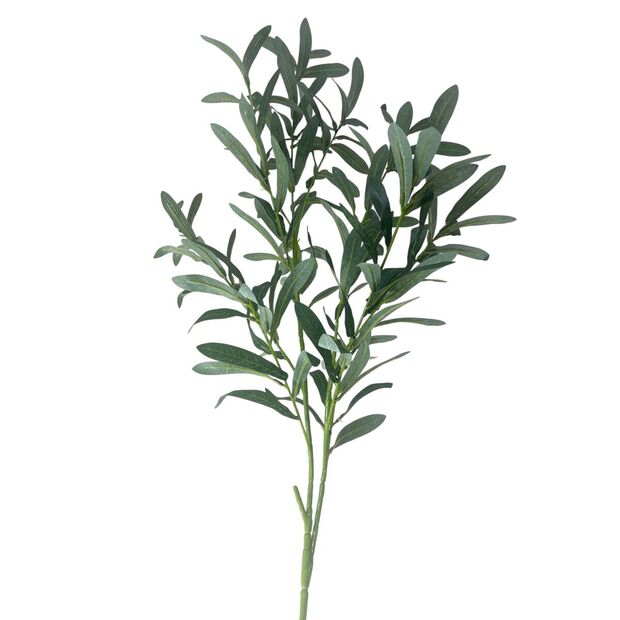The stem is wired for flexibility, making it easy to bend or cut to suit your display. Each branch is finished with lifelike fabric olive leaves, complete with natural shaping and veining for an authentic appearance. Durable and maintenance-free, this olive stem is a cost-effective choice for trade use.