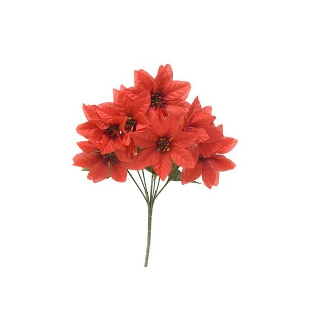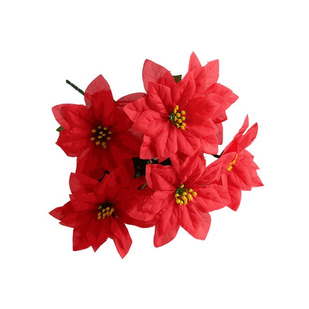 Each bush features 7 individually wired stems, topped with lifelike poinsettia flowers approximately 12cm (4.5") in diameter. The stems merge neatly into a single base for easy potting or vase arrangements, but can also be cut apart for use in smaller projects. At an overall length of 30cm (12"), this size is versatile for a wide range of displays.