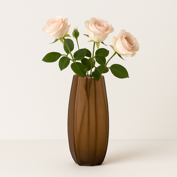 Bring warm, modern style to arrangements with this tall, ribbed amber glass vase. The refined fluted profile and narrow 8.5 cm opening keep stems upright for clean, contemporary designs — perfect for weddings, event tables and retail bouquets.