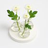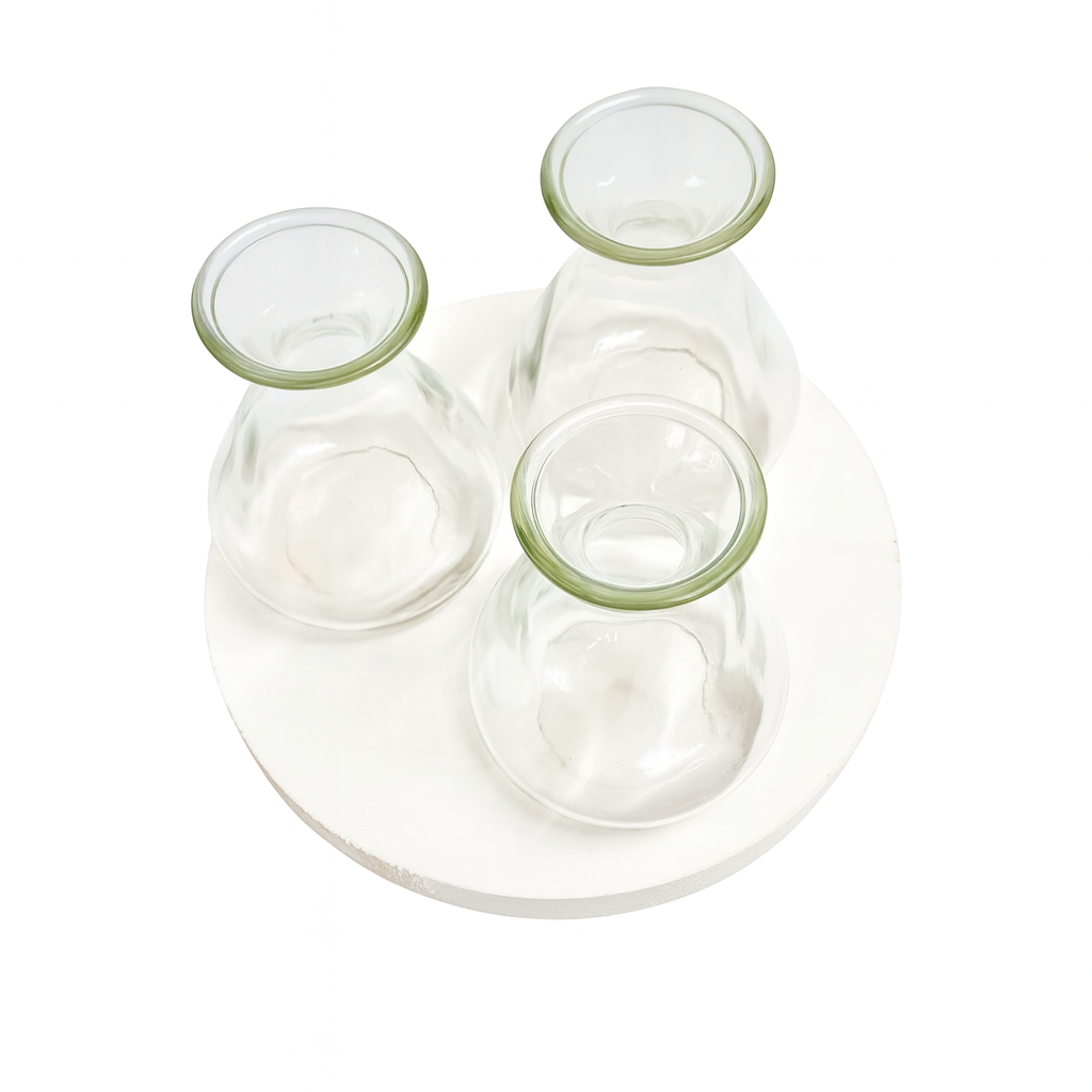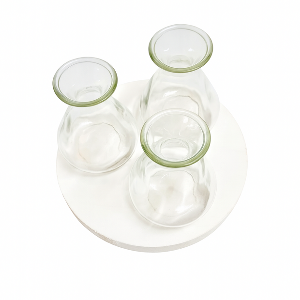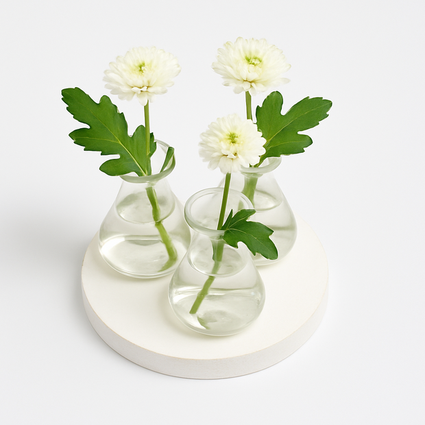 The Floralcraft® Glass Bud Vase Trio is designed to bring understated elegance to your décor. Each set includes three small bud vases, neatly arranged on a round white wooden base – ideal for showcasing single stems, greenery, or seasonal blooms.