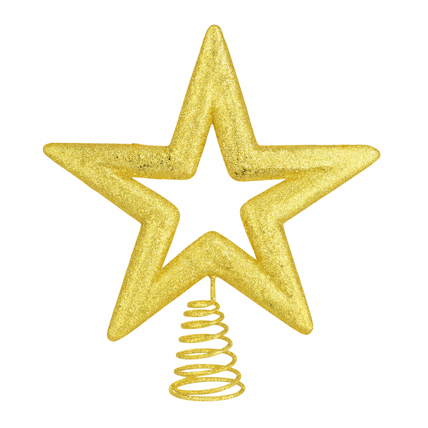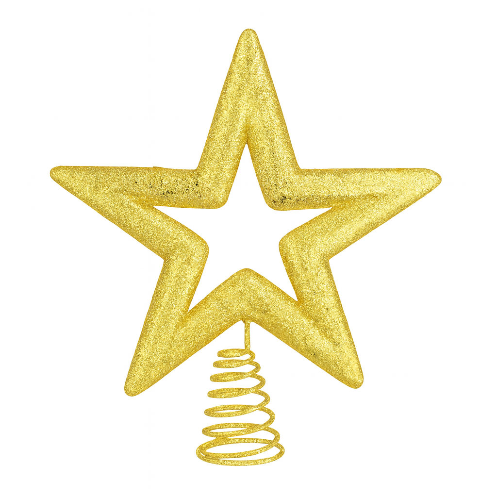 Complete your Christmas display with the Floralcraft® Gold Star Tree Topper. This beautifully crafted 22cm star is coated in shimmering gold glitter, adding a festive sparkle to your holiday décor. Designed to fit securely on the top branch of your tree, it features a lightweight construction and a traditional coil spring base, allowing quick and stable positioning.