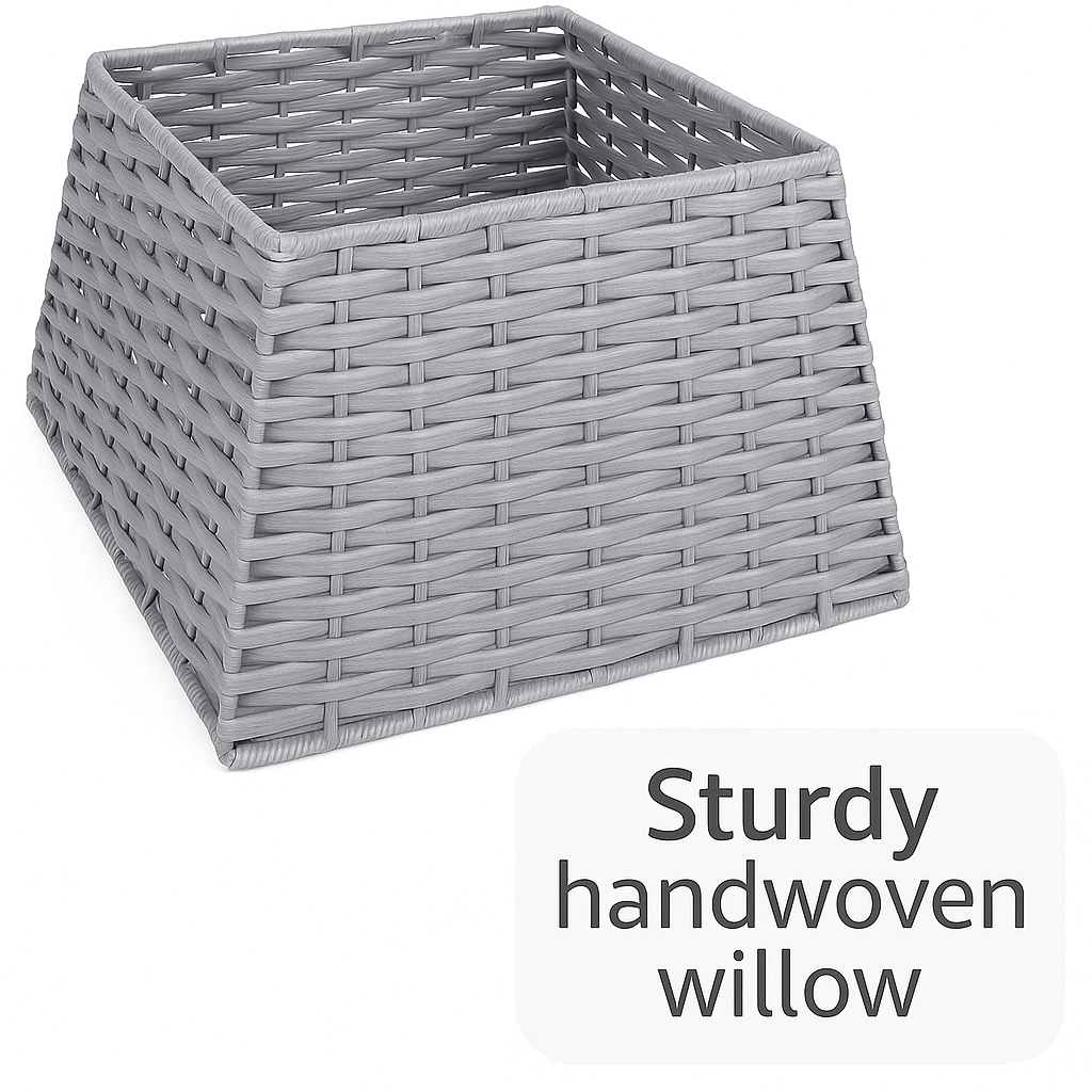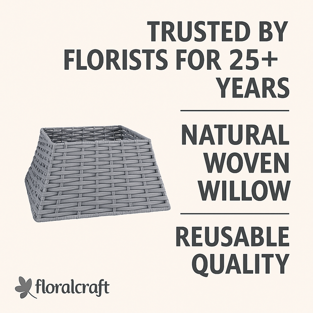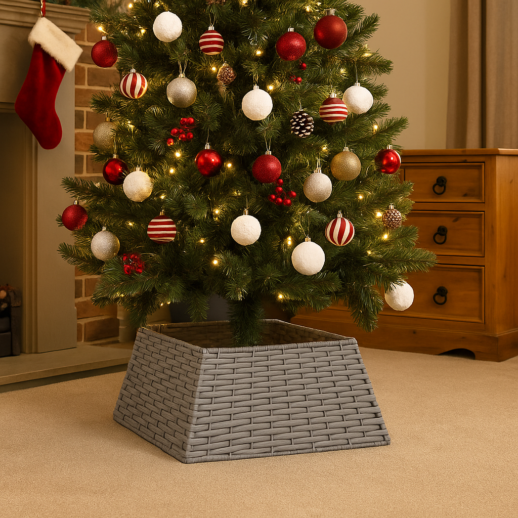Floralcraft® grey square Christmas tree skirt — 35×35 cm top, 50×50 cm base, 28 cm high. A modern wicker collar to hide your tree stand.